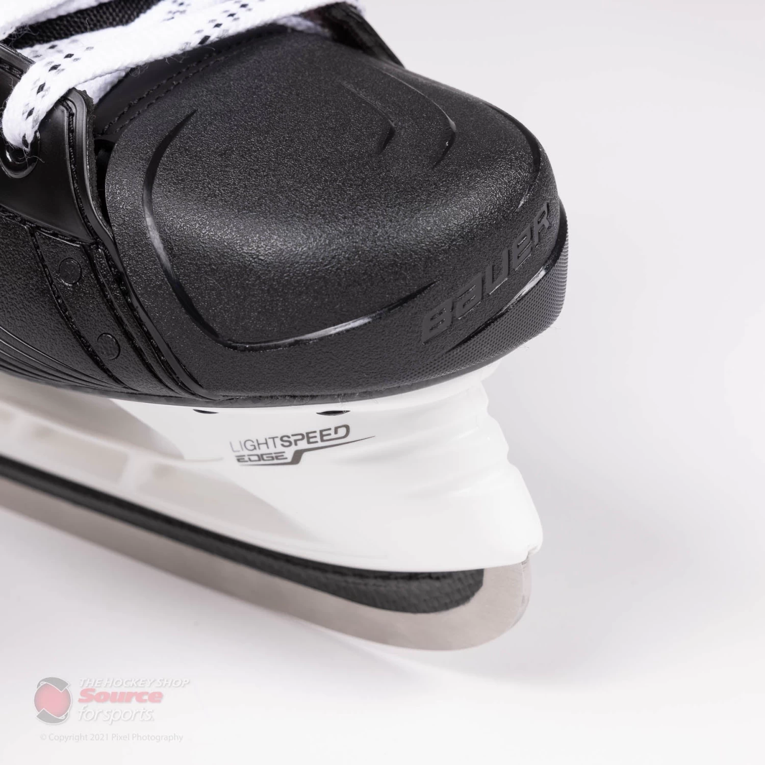 Bauer has once again outdone themselves. The gradual transition from black to light grey coupled with the neon green accents, a bright red tongue, and a glossy finish make for a skate that will catch your eye right away.