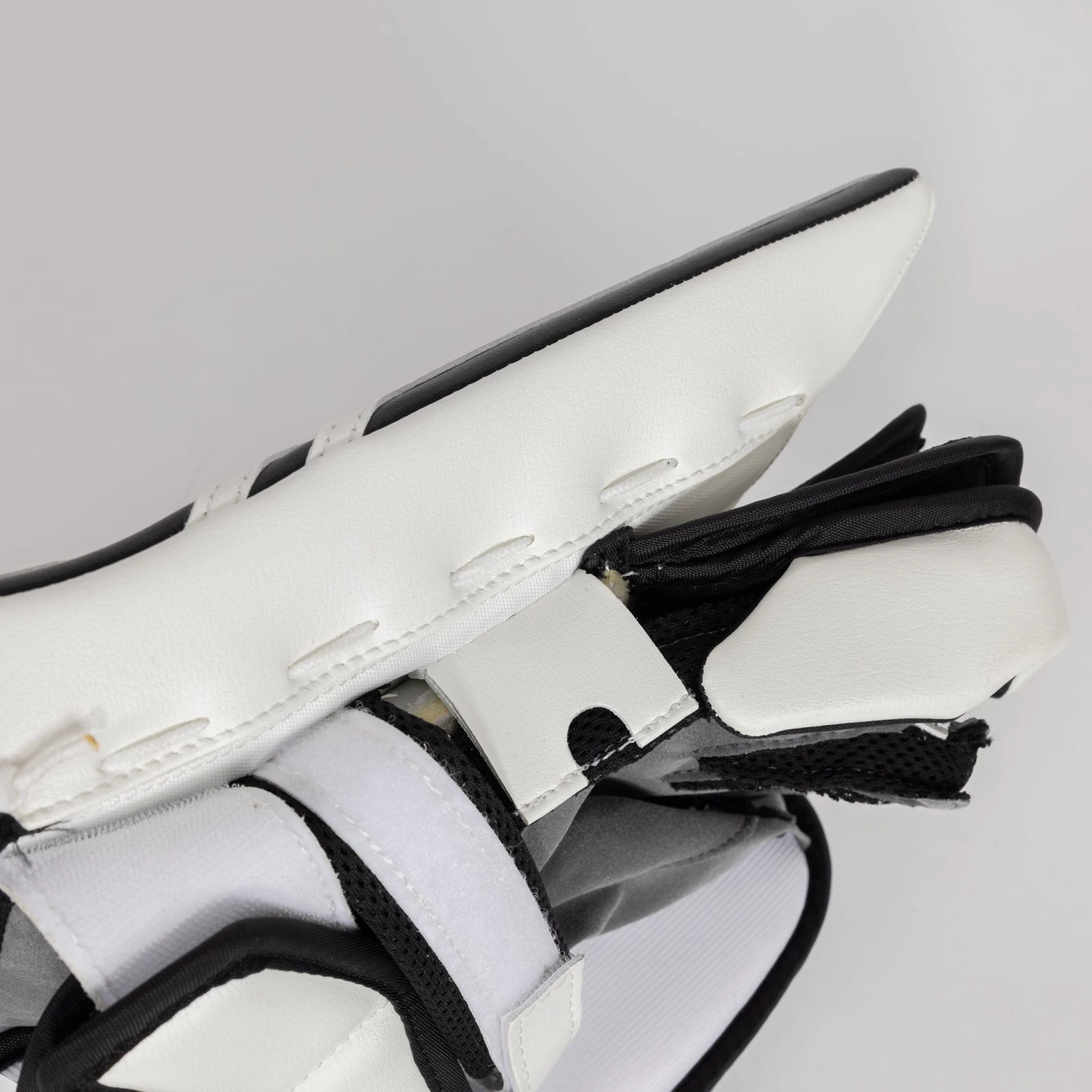Featuring a beveled nose with high-density wrap-around finger protection, this blocker offers comprehensive coverage and advanced safeguarding for young fingers. The fixed finger coverage provides an added layer of protection and a secure feel, allowing junior goalies to play their best without worrying about potential injuries.