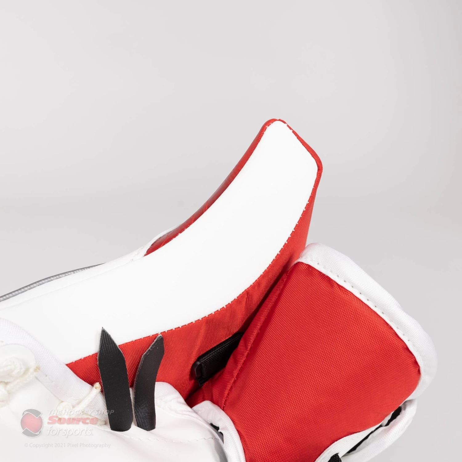 The CCM Extreme Flex 5 Goalie Catcher is available in a range of stock colors, as well as in endless variations through CCM’s customizer. Customizing the CCM EFlex 5 Catcher allows for a variety of colour and spec changes. CCM custom gives you the option to change the break angle to the 580 or 590, both found in the Axis Catcher line. This gives goalies full autonomy of their glove preference, while still being able to have their entire setup with the E-Flex 5 Graphic. For a full list of custom options and availability, please contact one of our customer service specialists for more details.