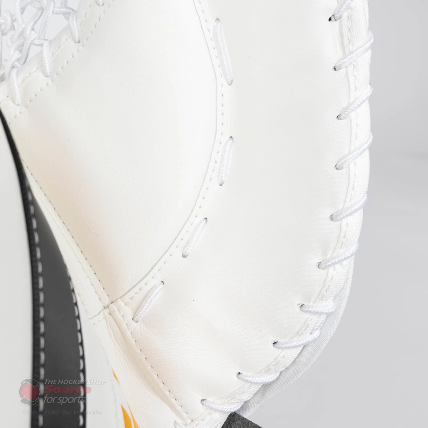 The CCM Extreme Flex E5.9 Senior Goalie Catcher is a stock only color offering, available in the following colorways; Boston, Chicago, Detroit, Montreal, Toronto, All White, White / Black, and White / Navy. The E5.9 Catcher is available in Regular and Full Right hands.