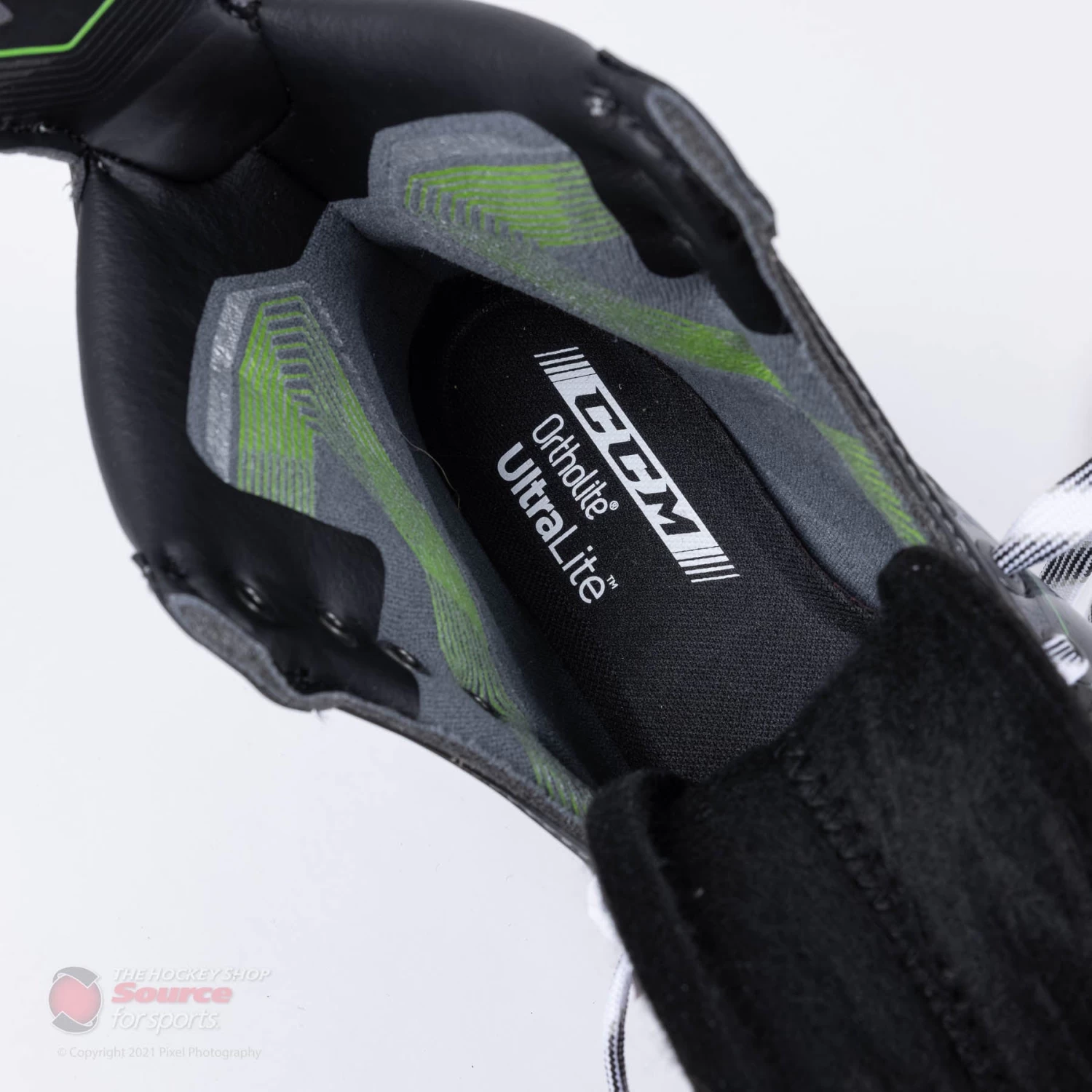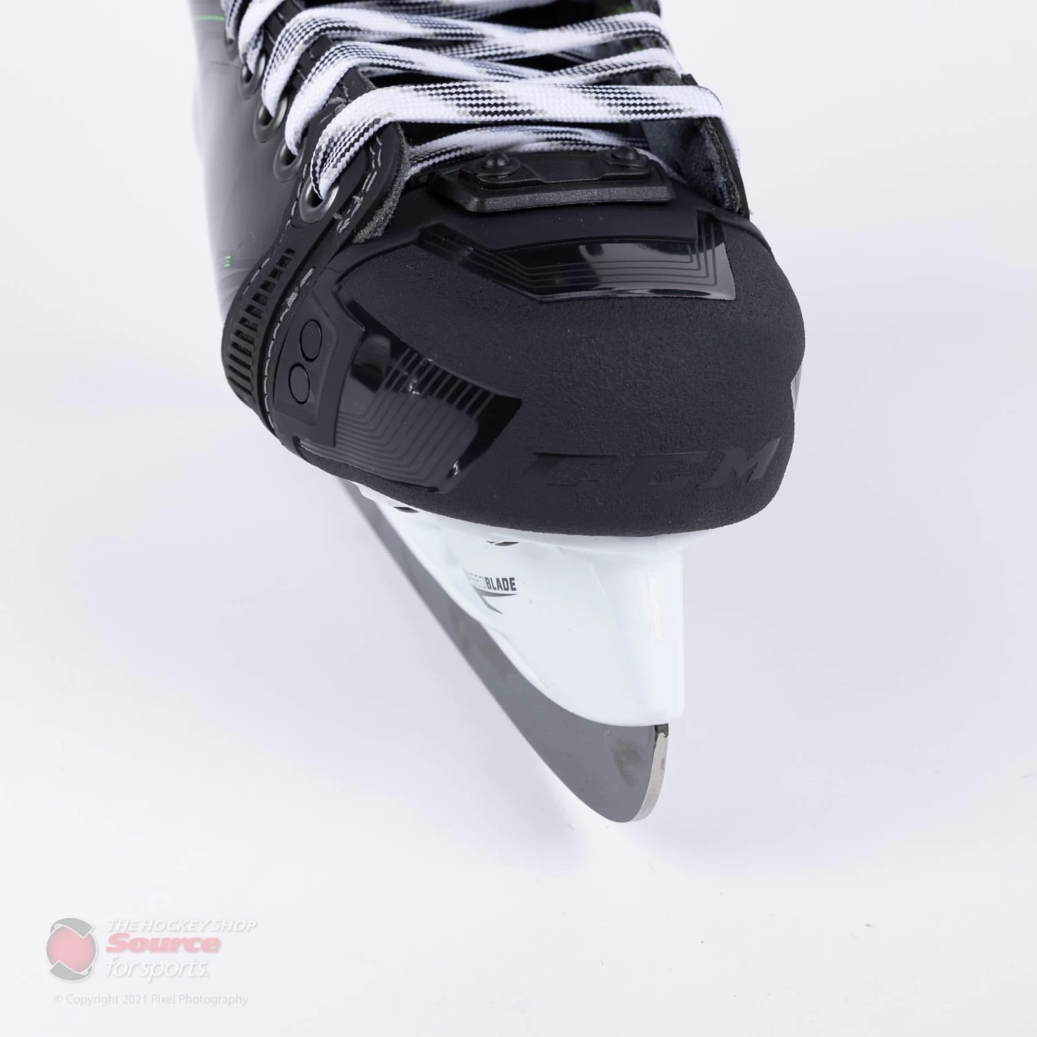 New to CCM is the asymmetrical toe cap attached to the boot. Maintaining the same level of protection, the redesigned tope cap decreases the amount of negative space in the boot, improving the overall fit and again, focusing on energy transfer from foot to skate.