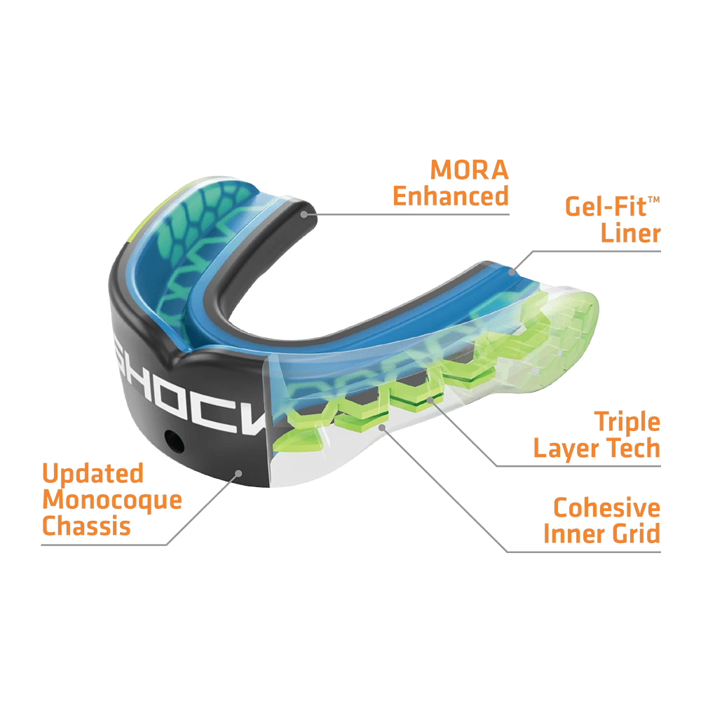 The Shock Doctor Gel Max Power Mouth Guard provides comfort and protection, while maintaining a low-profile design. This mouthguard features an updated monocoque chassis, reinforced outer frame and inner grid, and MORA enhanced technology.