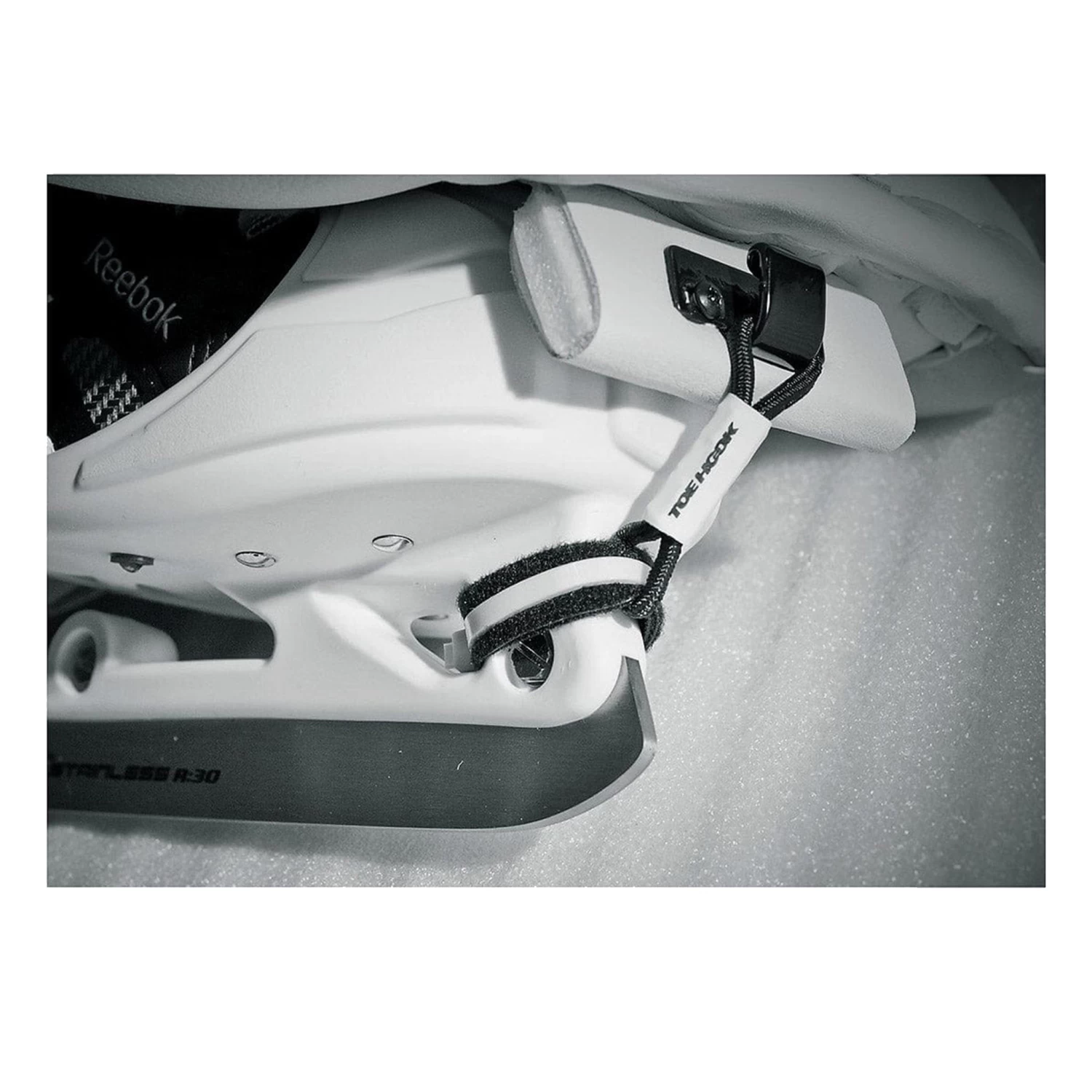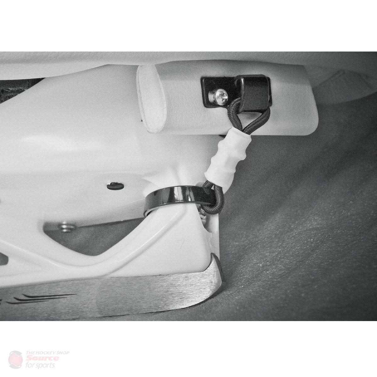 No Alterations to Most Pads or Skates – ToeHook fits nicely on most pads, using the holes vacated by those messy laces. The elastic extension can be secured to any make of goal or regular skate.