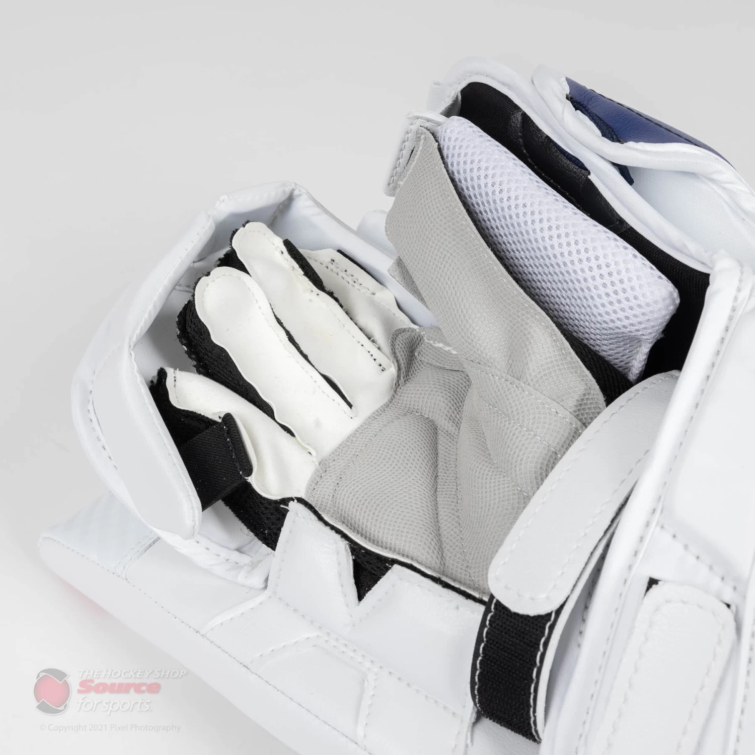 The V9 blocker uses a short, floating cuff to offer increased wrist mobility. It’s velcro adjustable in order to give goalies the option to wear the cuff as tight or loose as they want while offering good protection.