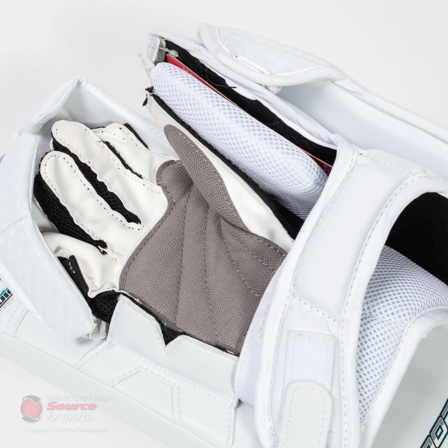 The Vaughn Velocity V9 Pro Senior Goalie Blocker comes in four standard colour options including All White, White/Red, White/Black, and White/Blue.