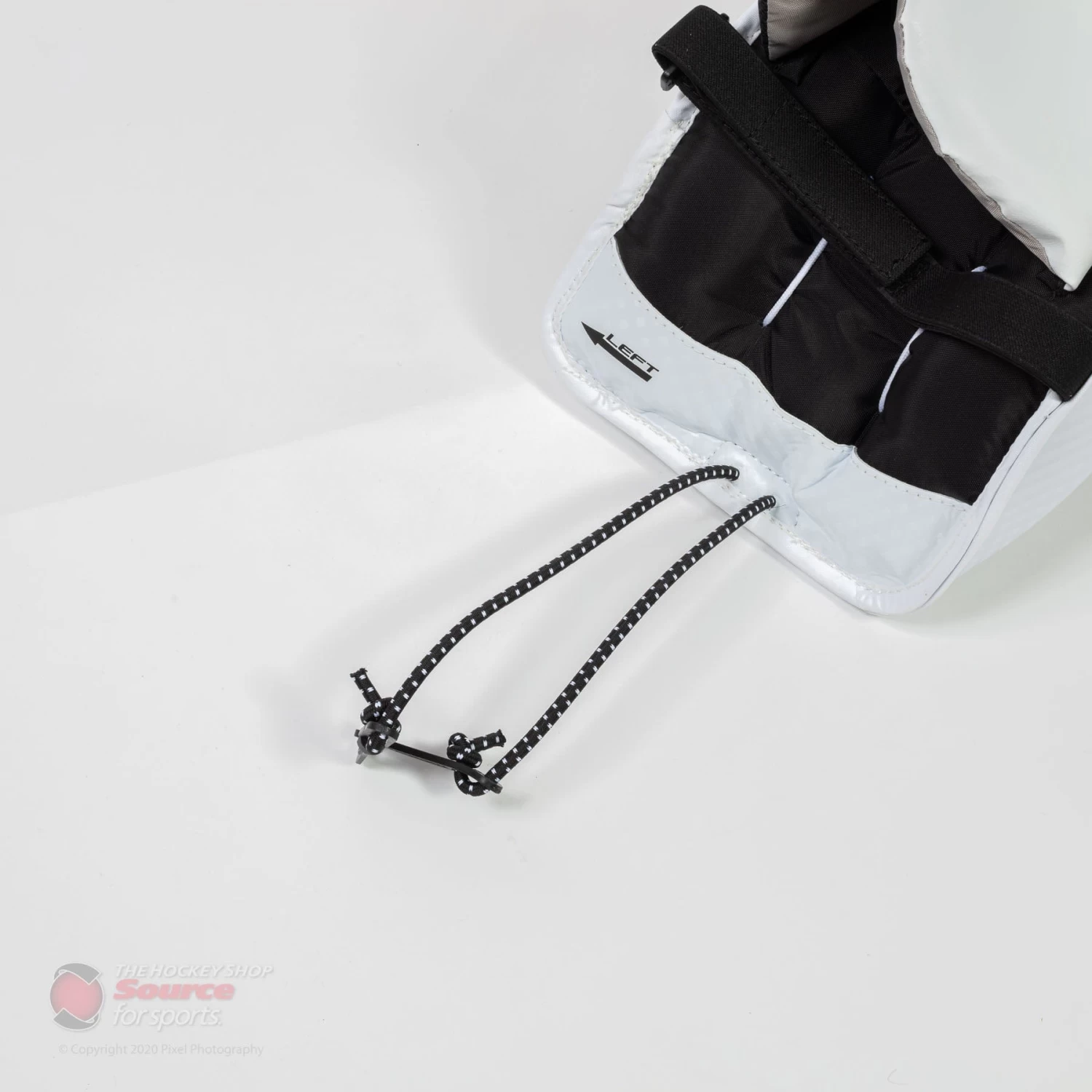 The V9 Youth features a redesigned strapping system and calf wrap allowing for a simpler, quicker and lighter system. The calf wrap uses a single velcro strap to seal its extended wings that offer better coverage over those of the VE8 shut. While still a fairly tight fitting leg channel, the V9 Youth has a widened inner leg cradle overall when compared to previous Velocity pads giving goals the feel of a tight fitting leg channel while offering the better rotation associated with a looser leg channel. Finally, the V9 Youth features a velcro bootstrap as well as the same bungee toe tie system seen on the SLR2 leg pads.