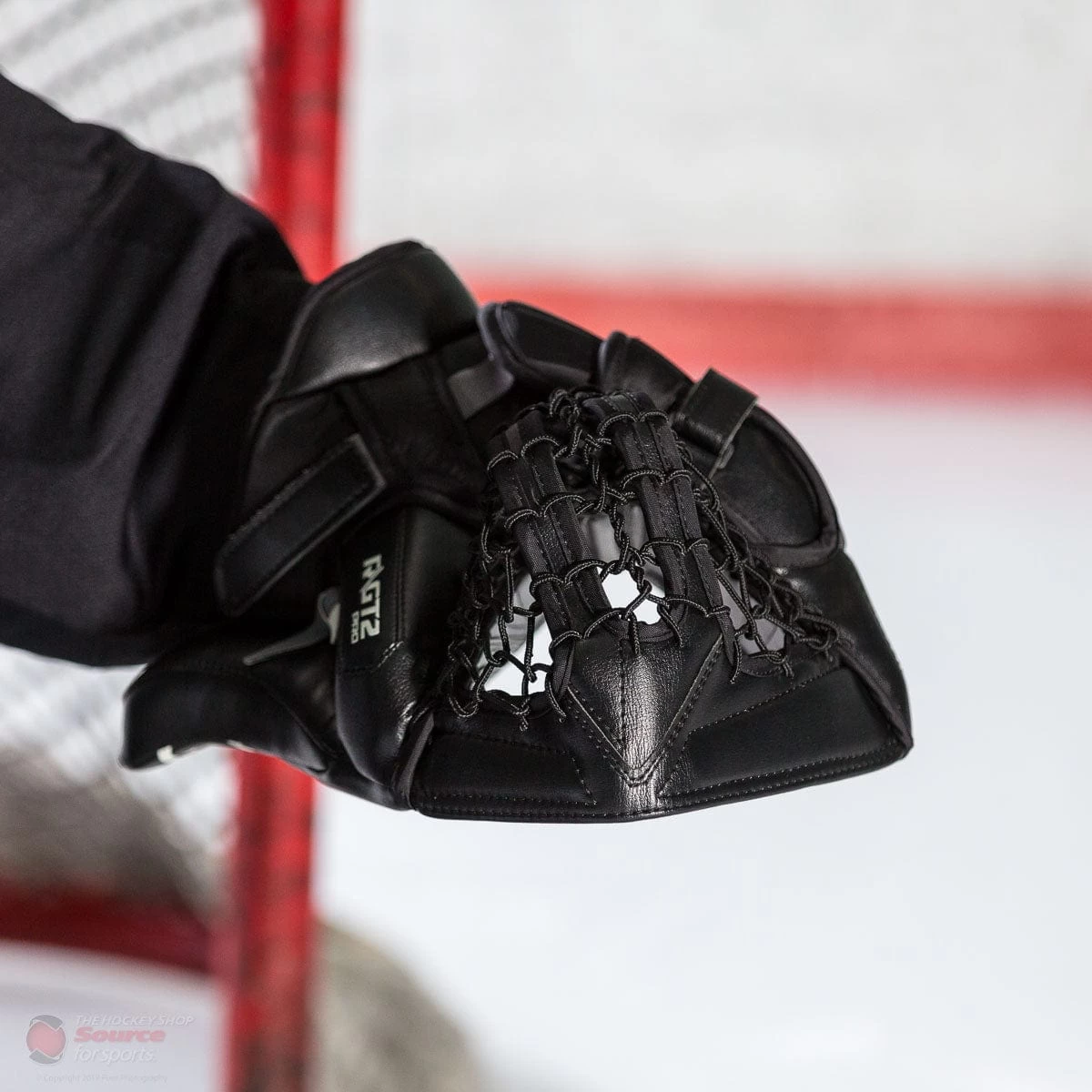 The cuff on the new Ritual GT2 Catcher allows the goalie their full wrist mobility without any restrictions. An open cuff lets the goalie present their glove the way they want to hold it, not forcing you to hold the glove a certain way. This makes the goalie feel more comfortable using the glove and therefor making the goalie more confident when making a glove save.